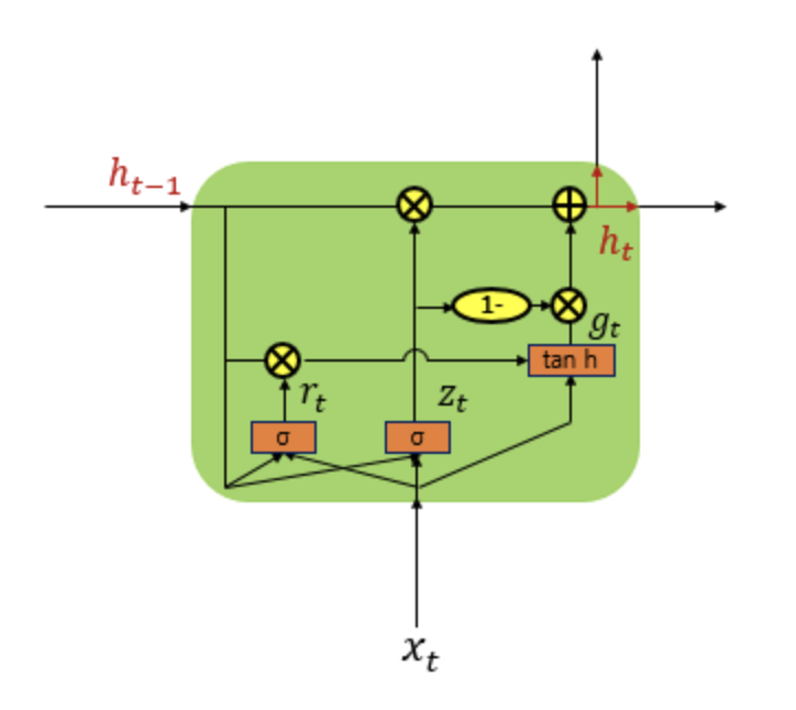 - gt (새로운 정보 후보) =tanh(Whg(rt∘ht−1)+Wxgxt+bg)
