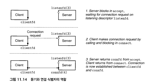 서버를 구현할 때는listenfd와connfd의 소켓 파일 디스크립터 두 개가 필요하다.