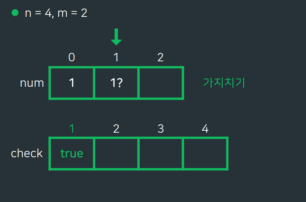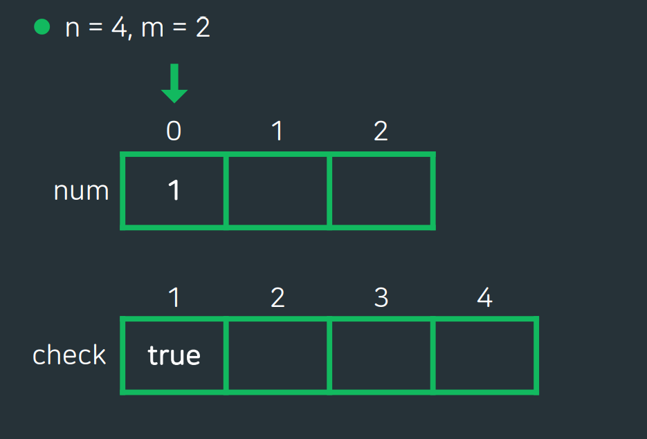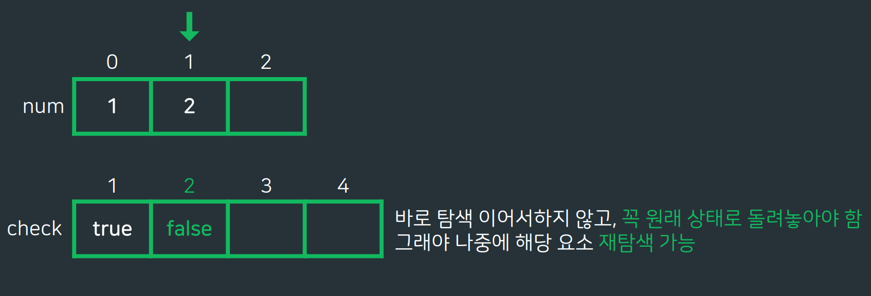 해당 수가 현재 수열에서 사용이 되었는지 확인하는 배열필요 ->즉, 수를 인덱스로 가지는 체크배열. ->가지치기 역할
