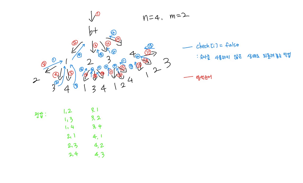 자연수 N,M이 주어졌을때 1~N까지 자연수 중 중복없이 M개를 고른 수열을 모두 구하라