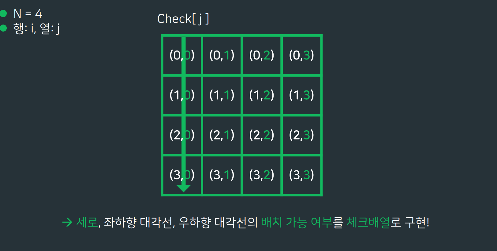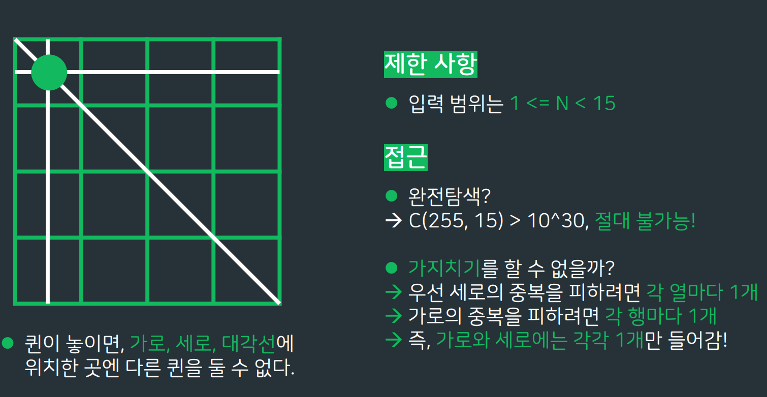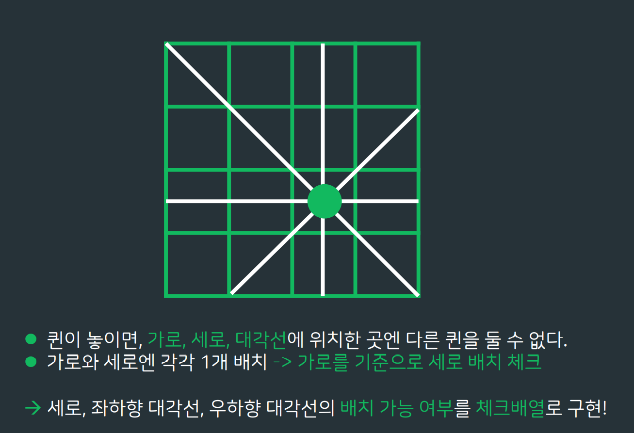 N X N인 체스판 위에 퀸 N개를 서로 공격할 수 없게 놓는 경우의 수를 구하는 문제