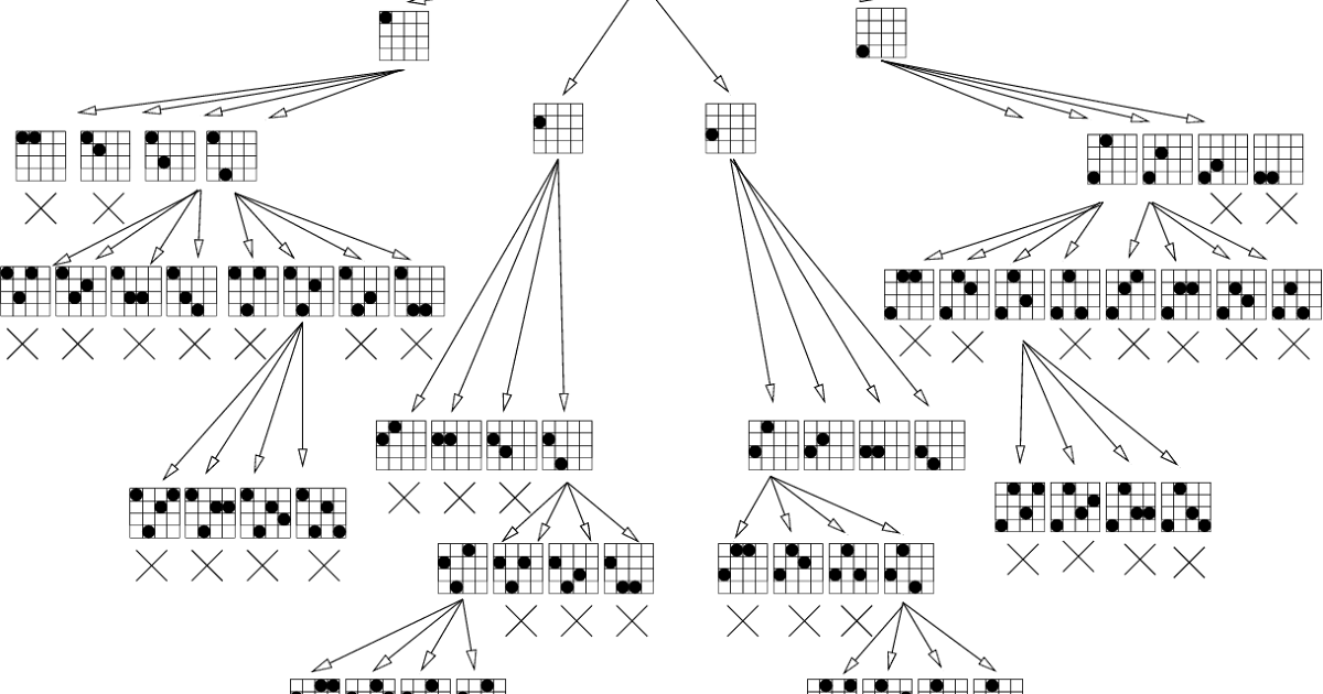 이 과정을 반복해주면, 아래그림과같이 퀸이 n개 존재할수있는 모든 경우의수를 모두 구해줄 수 있다. 구현방법에서 약간의 차이가 있지만 논리 흐름은 같다. 우리는 가로의 중복을 피하기위해서 행별로 퀸을 두었는데, 아래 그림은 열별로 퀸을 두는 경우의 수를 구한 모습이다.
