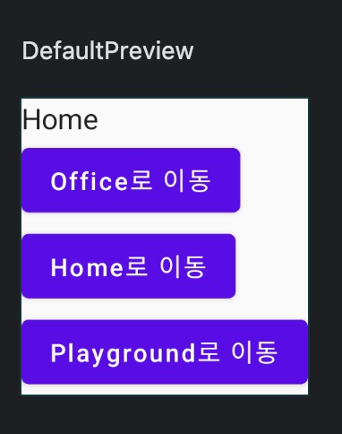 // 단계 4: `composable("Home")`를 만들고 안에 "Office로 이동" 버튼을