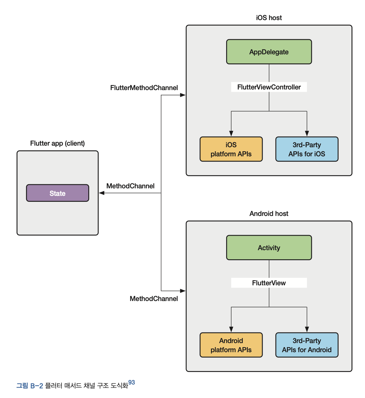 특히 이 부분은 제 책 부록 92P에서도 읽으실 수 있습니다. B.2 메서드 채널 파트를 보시면 메서드 채널이 플러터와 iOS(네이티브), 플러터와 안드로이드(네이티브) 간 소통을 하는 방식이라고 서술을 해 두었었는데요, 플러터 공식문서에서 소개하고 있는 메서드 채널의 짧은 예제등은 책에서 확인하시면 좋을 것 같습니다!