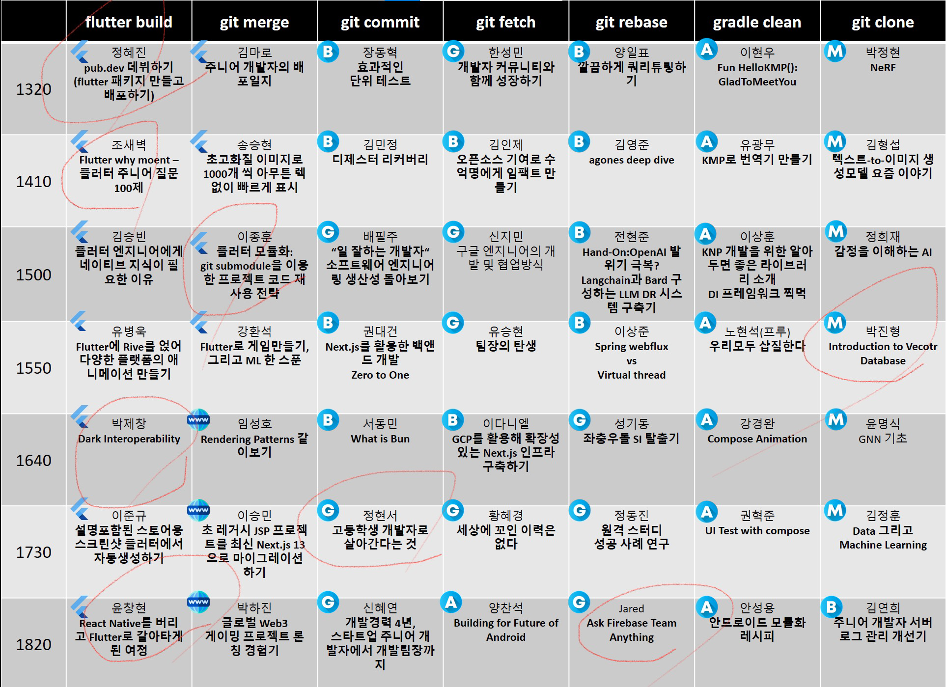 오늘 강연해주실 분들의 프로필입니다! 플러터 세션은 총 10개가 있었는데, 시간 상 전부 듣기는 어려웠습니다.