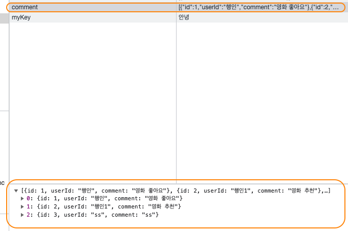 1) 로컬스토리지를 써서 데이터를 저장하는데 key-value로 구분되어 나와야 할 데이터가 key는 일정하고 value에서 배열 형태로 구분되어 나온다. Todolist로직을 사용해서 만들었는데.. 내가 뭔가를 잘못한 것일까 ㅠ