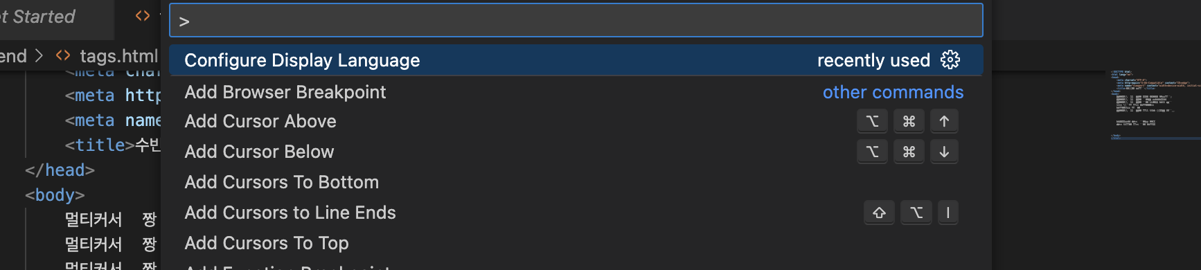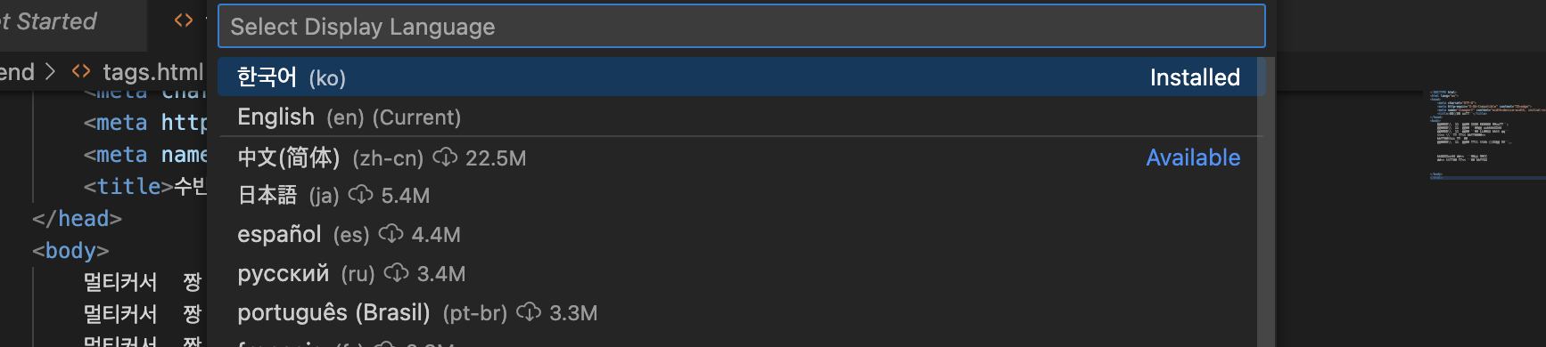1) Command + shift + p 2) 표시 언어 구성 클릭(최상단에 있는거)