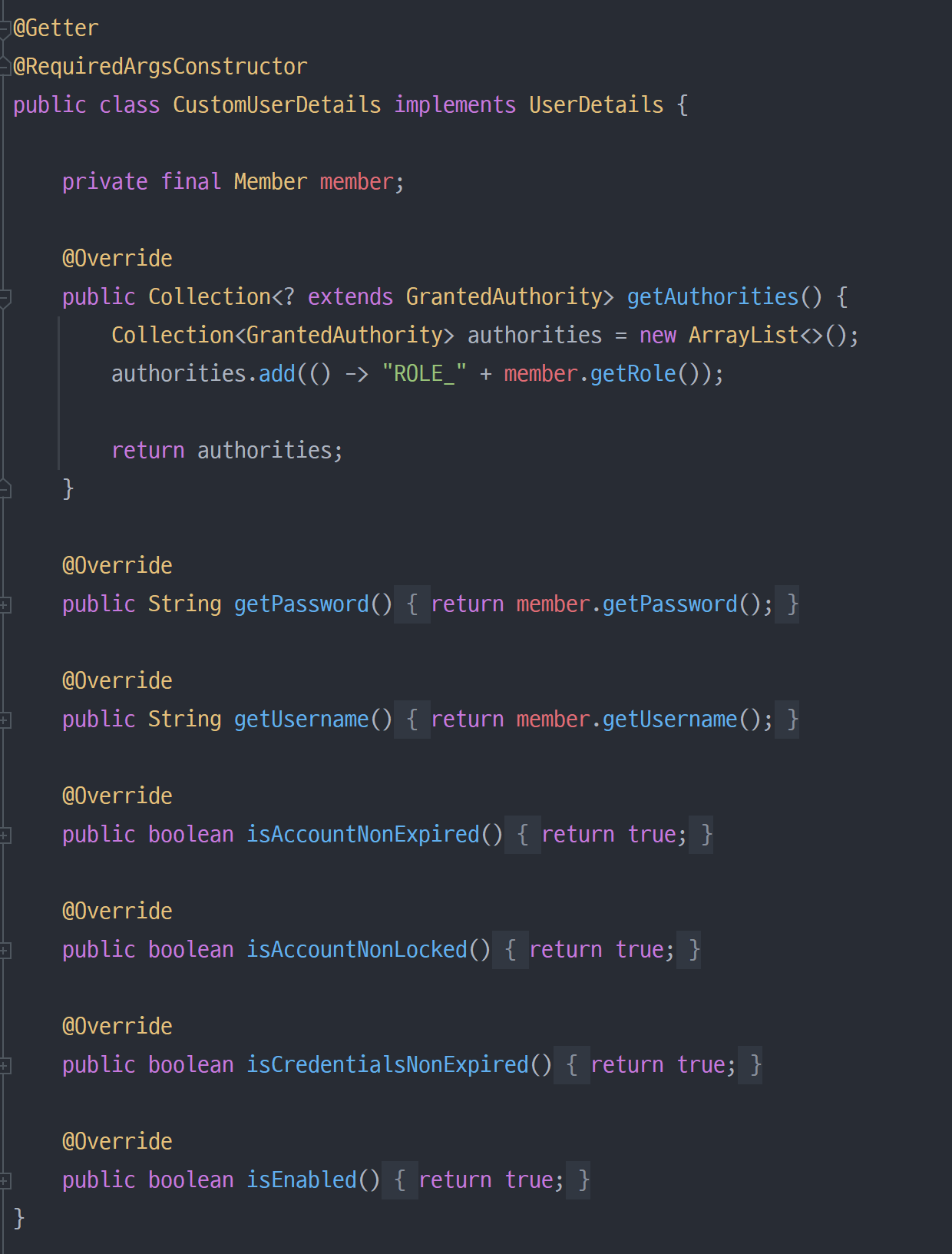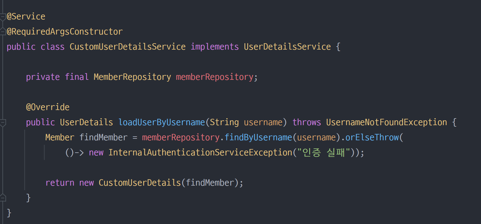그런 다음 시큐리티에서 인증을 하기 위해 필수적인 UserDetails, UserDetailsService 두 가지 클래스를 커스텀해 만들겠습니다.