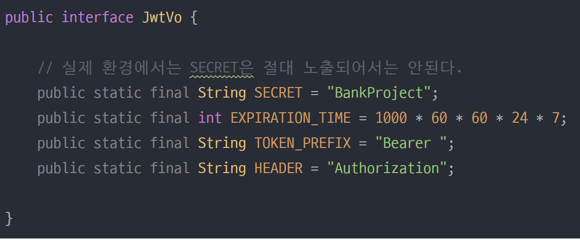 이제 JWT를 위한 소스를 만들어보겠습니다. 먼저 JWT 기본 설정을 위한 VO 클래스를 만듭니다. VO는 대칭키, 만료시간, 인증타입, 헤더 내용을 포함합니다.