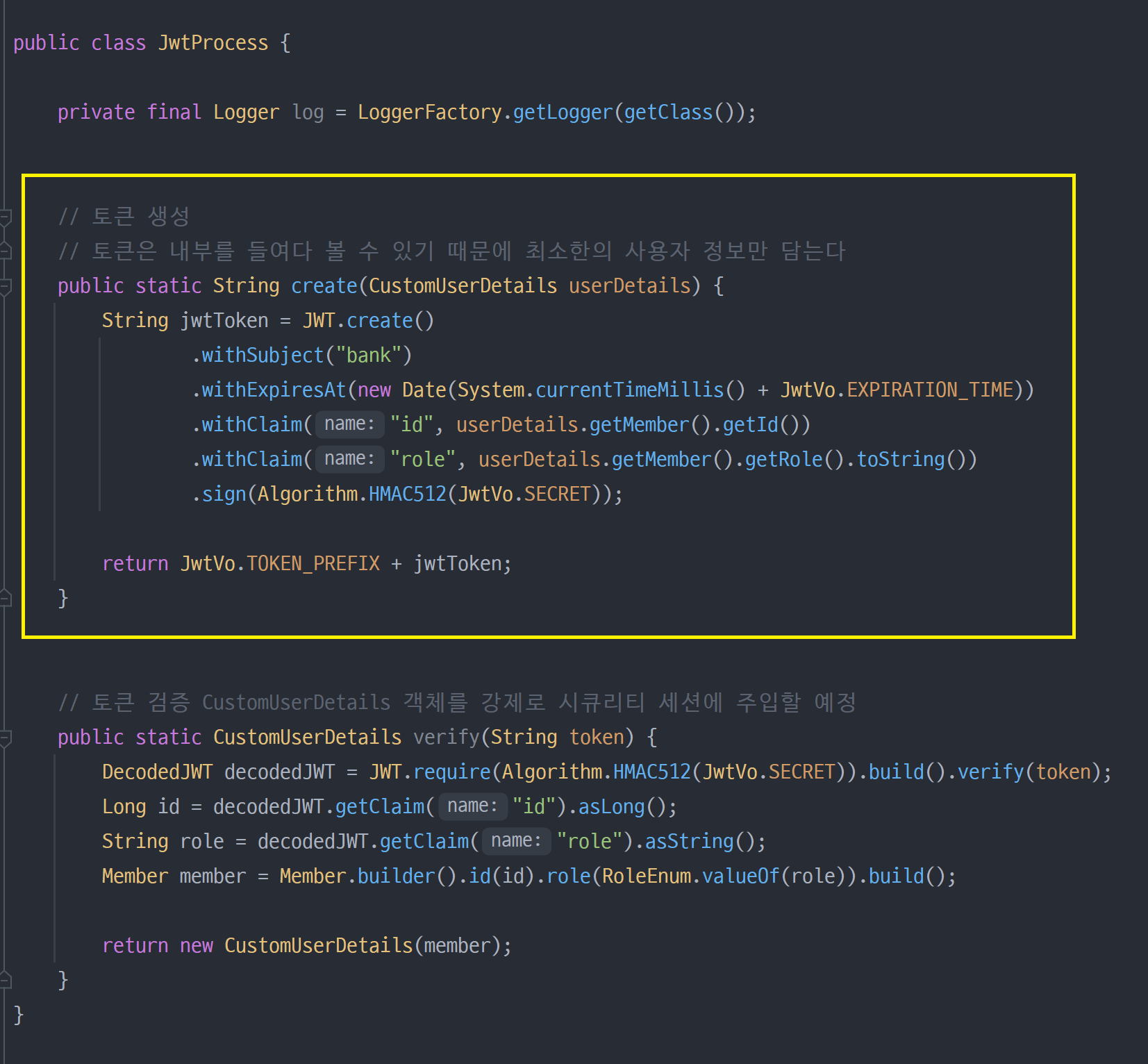 위 두 클래스는 익숙한 내용이니 별도의 설명은 생략하겠습니다. 그런 다음 토큰을 만들고 검증하는 기능을 가진 객체를 만들겠습니다.