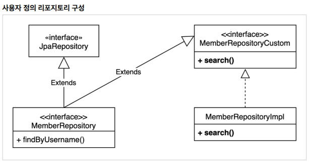 이 같은 원리로 만약 MemberRepositoryCustom을 구현하는 Repository가 10개이고, 각각 모두 다른 방식으로 searchMember() 매서드를 오버라이딩 한다면 MemberRepository는 각각 다른 10개의 searchMember() 매서드를 사용할 수 있게 되는 겁니다.