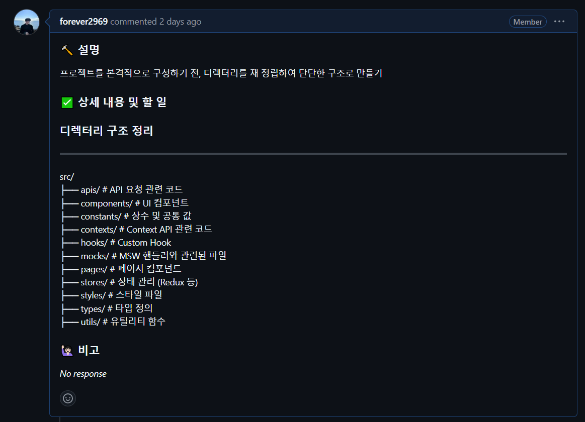 Issue를 생성하고 이를 마쳤기 때문에 폴더 구조가 변경될 일은 거의 없다고 생각할 수 있다.