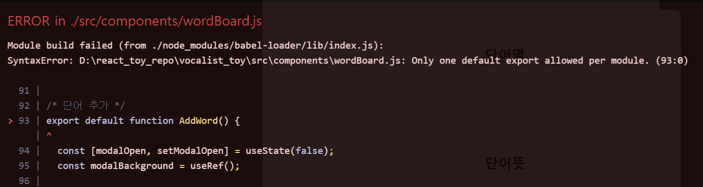 버그가 떠버렸다. 하나의 default export만 가능하다고 한 걸보니 내가 export default를 여러 개 사용하면 에러가 뜨나보다. 해결 : 한 js 스크립트에 default 가 여러 개 존재할 수 없다. 그래서 모든 function 앞에 export로 바꿨다.