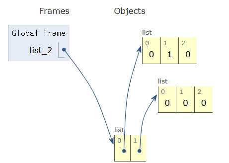 이는 list_1을 만드는 과정에서 [0, 0, 0] 리스트를 복제하고, 얕은 복사(shallow copy)가 일어났기 때문이다.