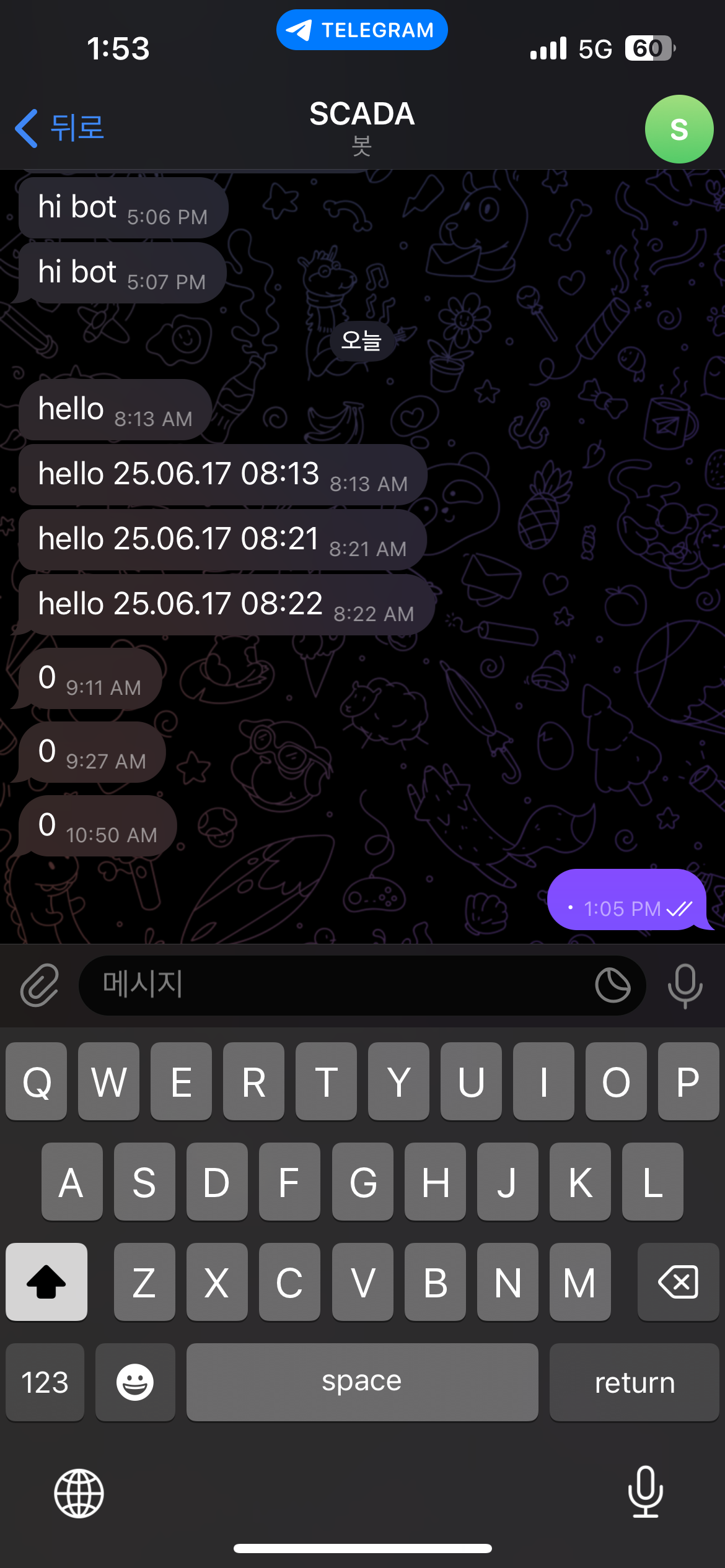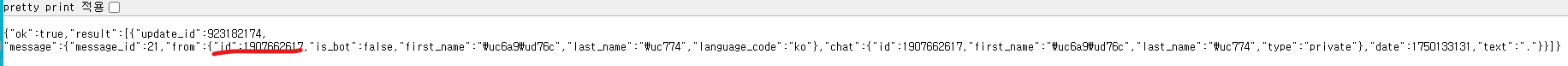 아무 글자라 메시지를 보내둔다. (getUpdates 메소드 실행 시 'no result' 방지)