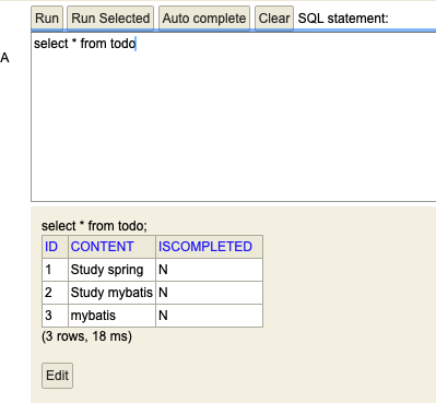 insert into todo (content, isCompleted) values ('Study mybatis', 'N');