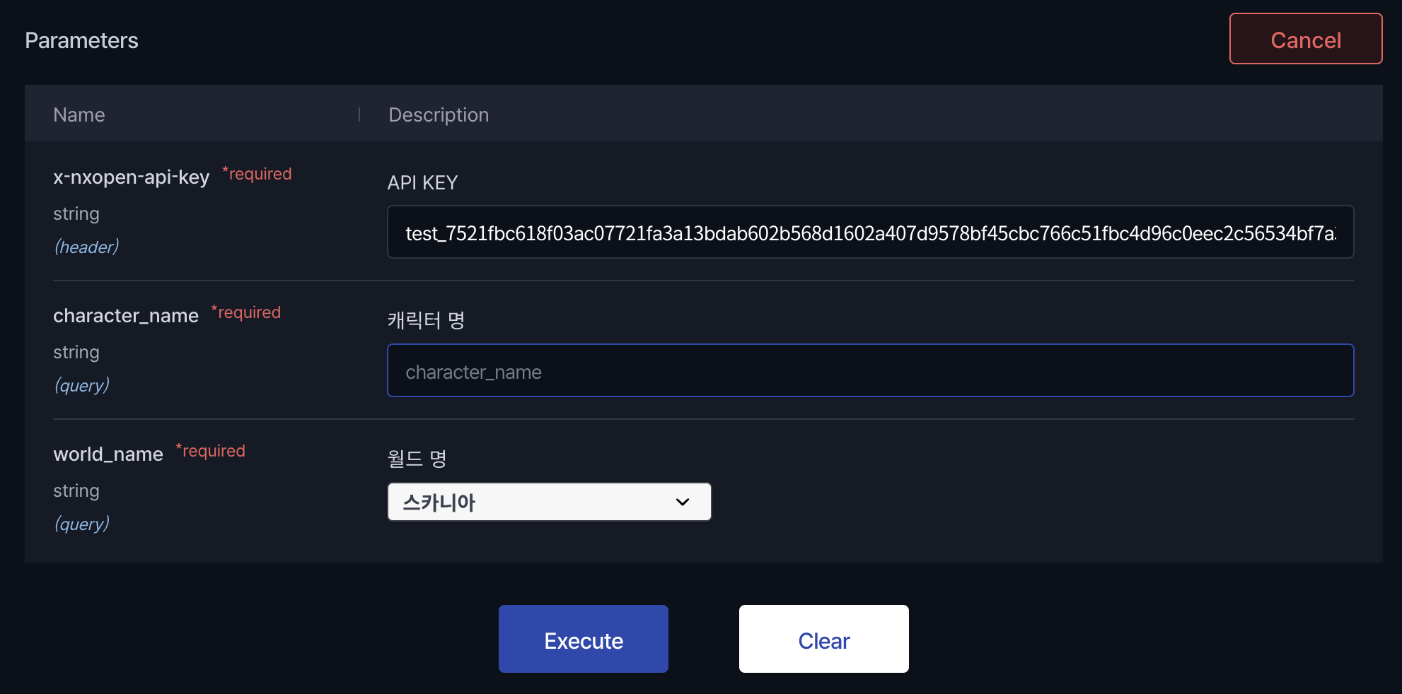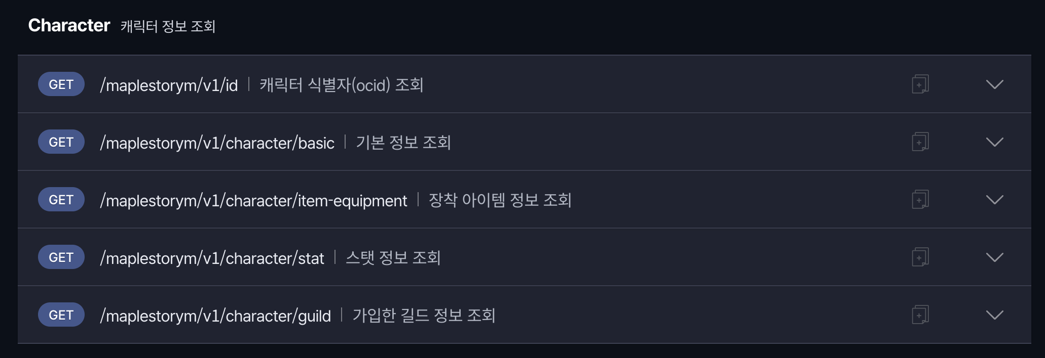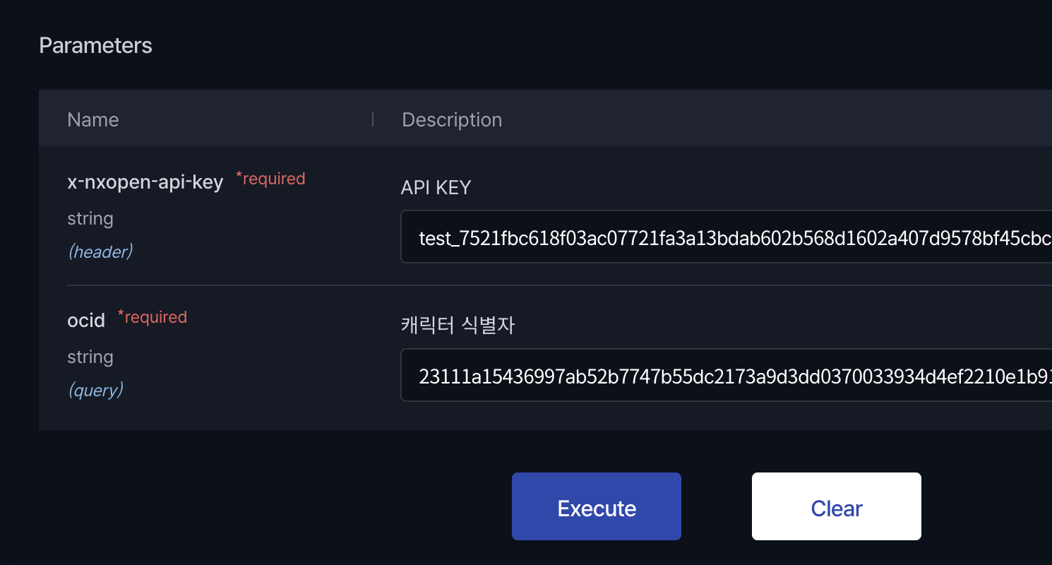 캐릭터 명을 파라미터로 넘기면 고유 식별자를 응답하게 된다.