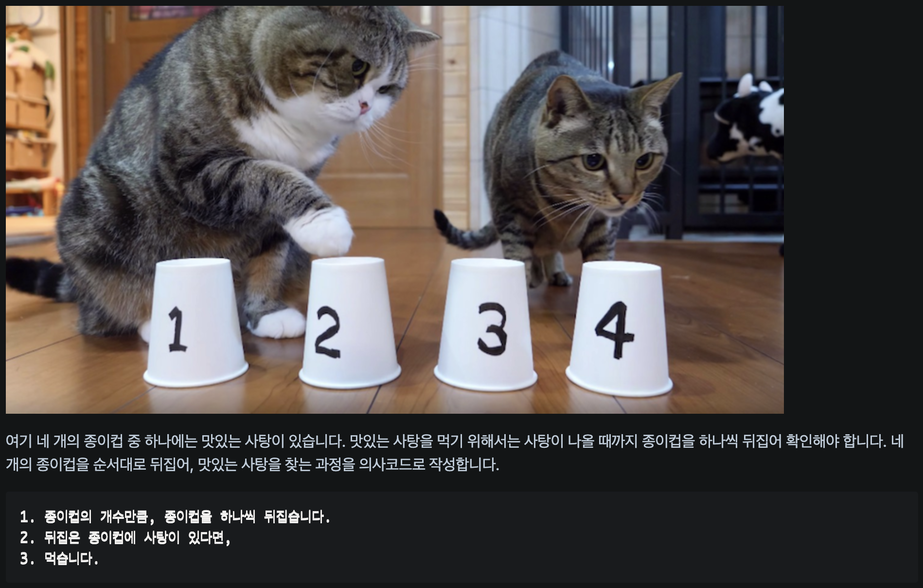 의사코드는 프로그래밍 언어로 코드를 작성하기 전에, 무엇을 어떤 과정을 통해 만들지 사람의 언어로 먼저 작성하는 것이다.