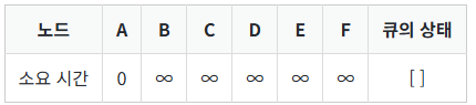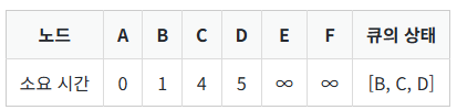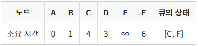 A에서 출발했을 때 각 노드까지 가는데 걸리는 최소 시간이 기록하기heapq 모듈을 이용한다.(소요 시간, 노드)다.bfs와 달리 heap에서 꺼낸 후에 방문 처리한다.#소요 시간을 초기화할 때 사용할 무한대(inf)를 이용하기 위해 수학 모듈 사용