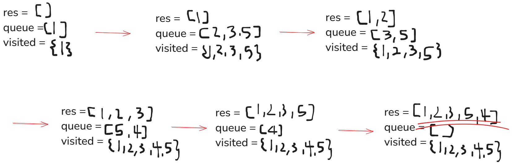1을 방문한 후에 노드 1에 연결된 노드 [2, 3, 5]를 순서대로 스택에 넣는다.5가 먼저 나온다.[1, 5 ...] 순이다.그래프를 "너비" 우선 탐색하기