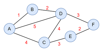 "D": [("A", 5), ("B", 2), ("C", 4), ("F", 3)],