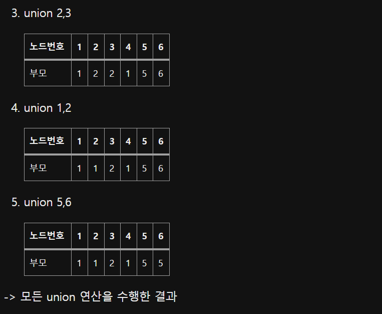 {1,2,3,4,5,6}의 집합과 4개의 union 연산 union 1,4 union 2,3 union 2,4 union 5,6이 주어졌다.