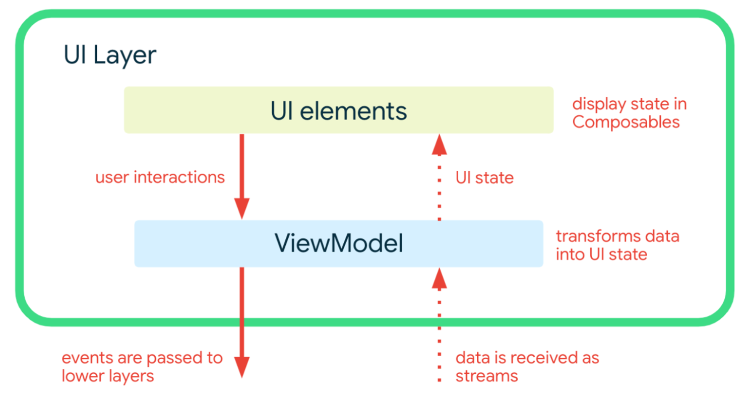 ViewModel 은 use cases 및 리파짓토리에서 데이터 스트림을 수신하고 이를 UI 상태로 변환한다. UI 요소는 이 상태를 반영하고, 사용자가 앱과 상호작용을 할 수 있는 방법을 제공한다. 이러한 상호 작용은 처리되는 ViewModel 에 이벤트로 전달된다.