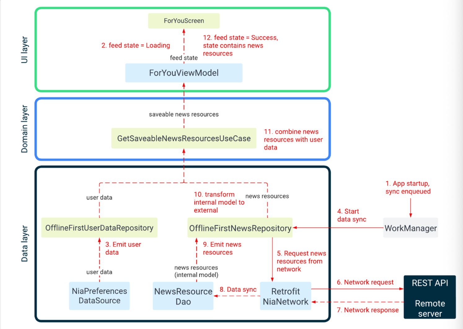 WorkManager 는 OfflineFirstNewsRepository 를 호출하는 sync job 을 실행하여 원격 data source 와 데이터 동기화를 시작한다. (과거)