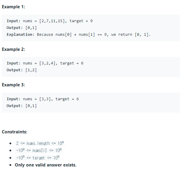 HashMap 을 사용하여 메모리를 조금 더 사용하지만 시간복잡도를 O(N)으로 줄일 수 있는 코드로 개선해 보았습니다.Key : Vaule 를 nums[i] : i값으로 저장하면서 target - nums[i] 연산값이 존재하는지 조건 처리를 합니다.// Hash Table