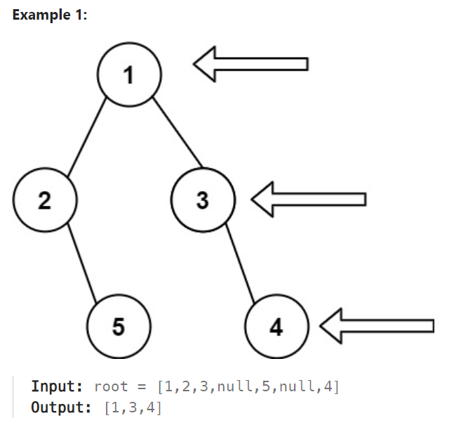- 이진 트리의 루트가 주어지면, 그것의 오른쪽에 서 있는 것으로 상상해보세요. 위에서 아래로 정렬된 볼 수 있는 노드의 값들을 반환하세요.