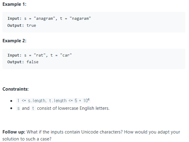 두 개의 문자열 s와 t가 주어지면, t가 s의 애너그램이면 true를 반환하고 그렇지 않으면 false를 반환합니다.
