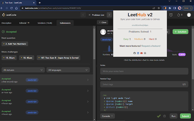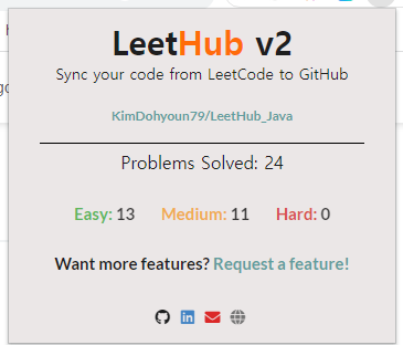 LeetHub를 연동하여LeetCode알고리즘 사이트에서 푼 문제를 자동으로GitHub에 커밋해주는 플러그인입니다.- LeetCode UI가 변경되면서 이전 버전의