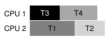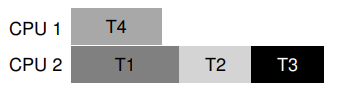 여기서 볼 수 있듯, 정적 스케줄링은 T1, T2, T3가 모두 한 프로세서에서 돌아가게 하고, 따라서 작업이 완료되게 하기 위한 전체 시간을 상당한 수준으로 늘려버리는 보수적인 접근법으로 이어진다. 이러한 작업들을 병행적으로 실행할 수 있었을 것임에도, 데드락에 대한 걱정으로 이를 포기한 것이다. 대가는 성능이다.