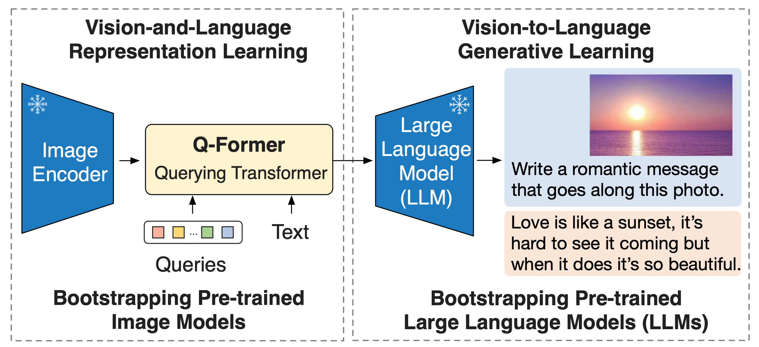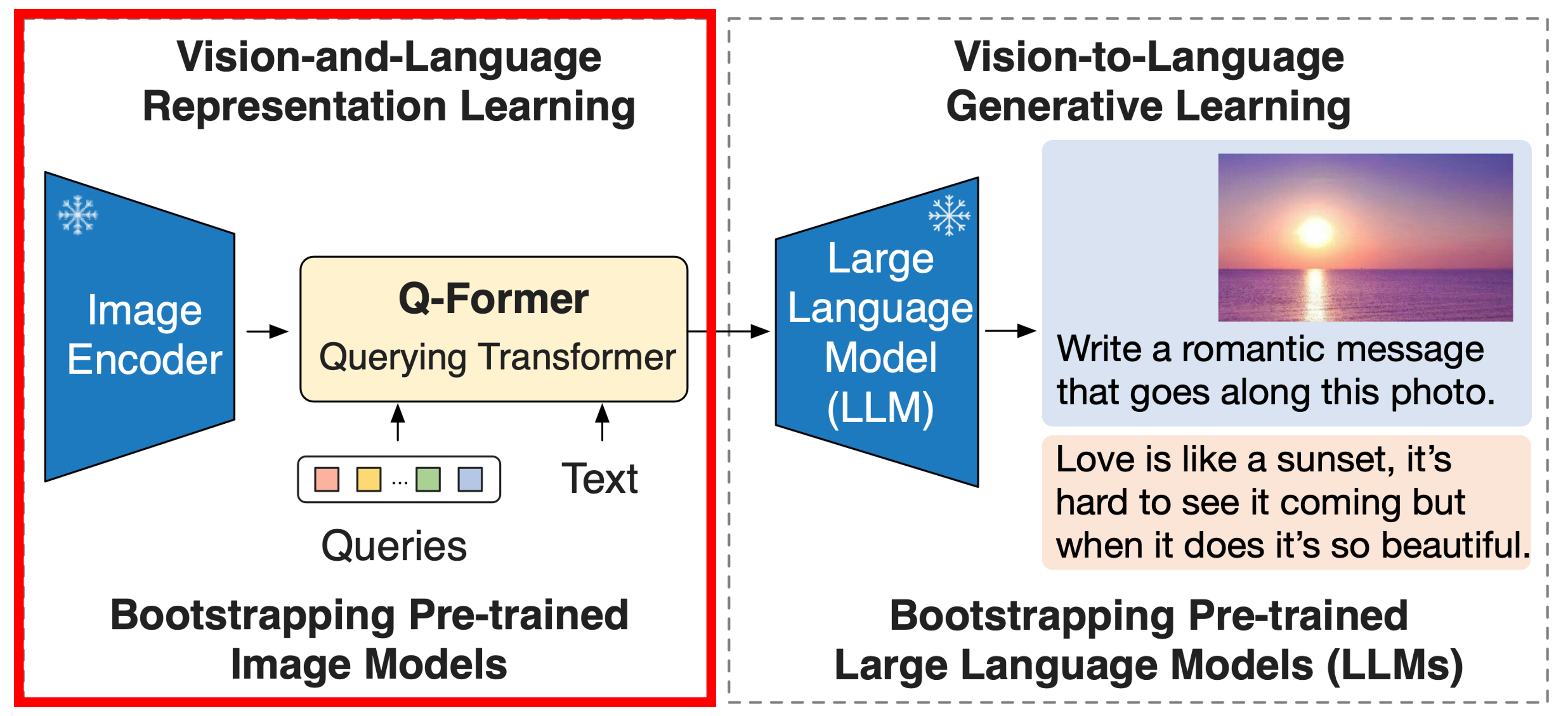 효율적인 시각-언어 정렬을 위해, 고정된(frozen) 유니모달 모델들과 함께 사용할 수 있는 Querying Transformer (Q-Former)를 제안했다.