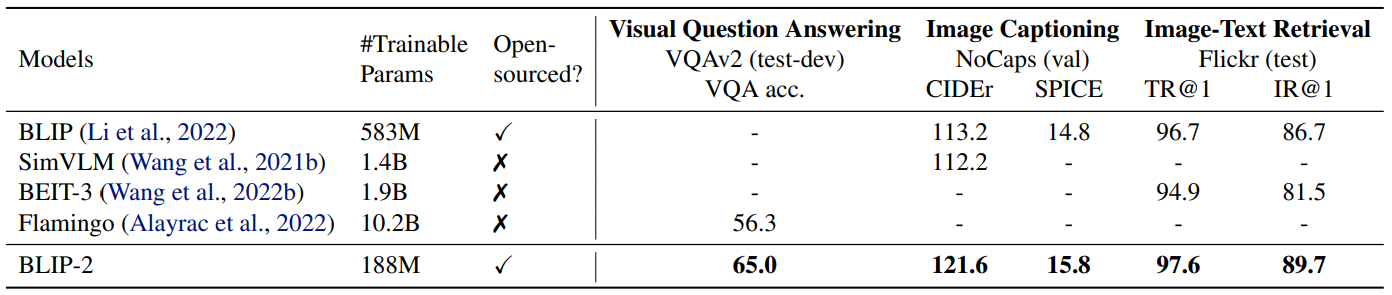 Zero-shot vision-language task에서 기존의 모델보다 훨씬 작은 파라미터 개수로 더 좋은 성능을 보여주고 있다.