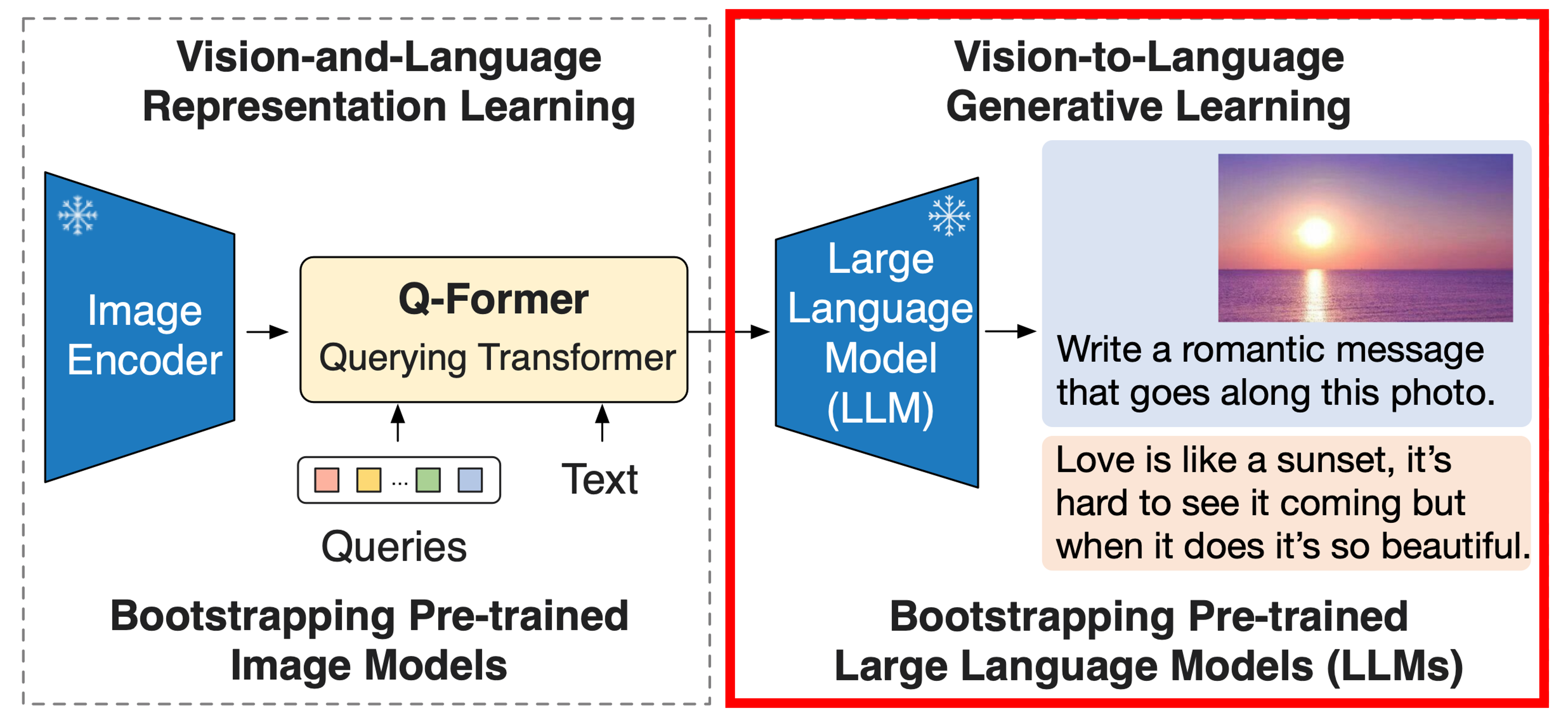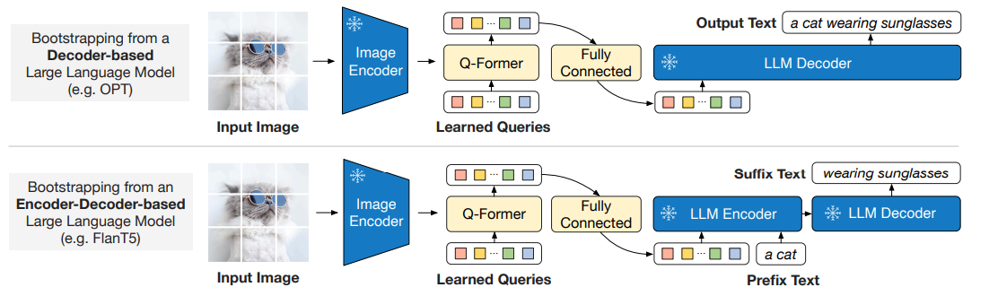 LLM의 언어 생성 능력을 활용하기 위해 고정된 이미지 인코더를 포함한 Q-Former를 고정된 LLM에 연결한다.