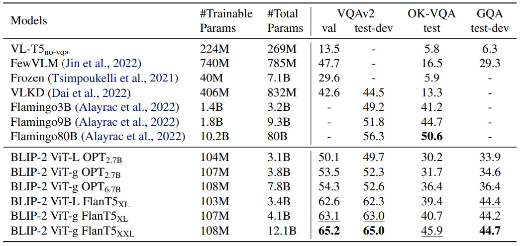 Zero-shot visual question answering 에서도 적은 파라미터로 좋은 성능을 보여주고 있다.