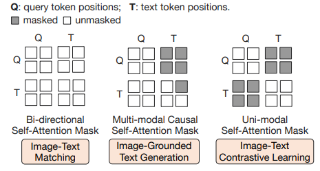 이를 위해 UniLM (Dong et al., 2019).과 유사한 멀티모달 causal self-attention mask를 사용해 쿼리-텍스트 상호작용을 조절한다. 쿼리는 서로를 참조할 수 있지만 텍스트 토큰을 참조할 수 없습니다. 각 텍스트 토큰은 모든 쿼리와 이전의 텍스트 토큰을 참조할 수 있다.