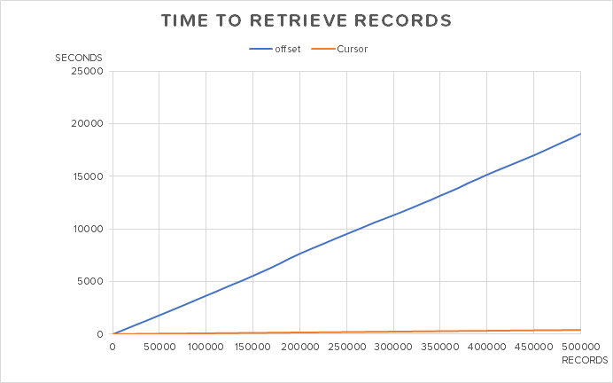 OFFSET 값만큼의 행을 읽고 건너뛰는 작업을 수행하기 때문에, 결국 앞에 있는 모든 행을 읽어야 하므로 성능이 선형적으로 저하된다.