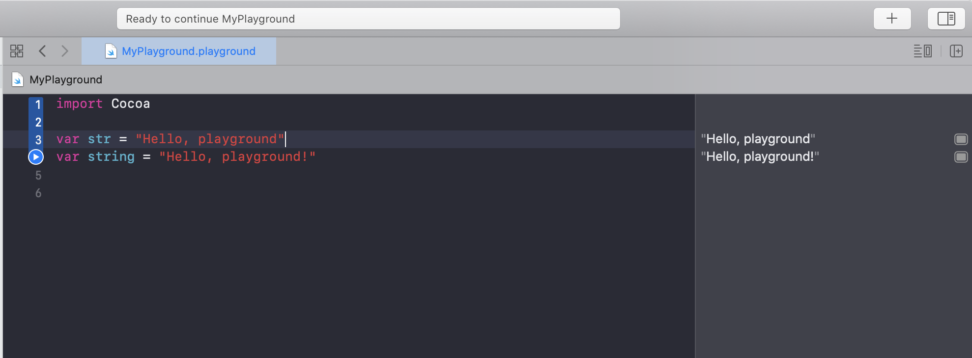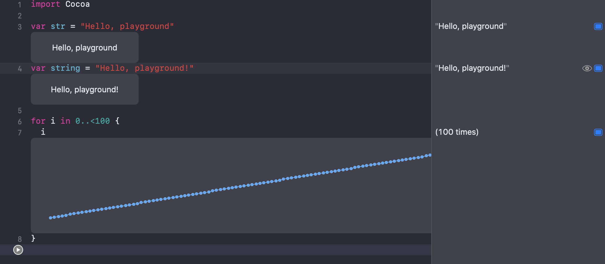 작성하는대로 오른쪽에서 확인할 수 있는데, 확인된 문자열에 마우스를 올렸을때 눈알 모양과 네모난 모양이 뜹니다. 네모모양을 클릭하면 파랗게 픽스가 되고, 왼쪽 문자열을 작성한 아래에 작은 메모창같은 것이 뜹니다. 거기에 출력 내용을 고정할 수 있어요. 스위프트