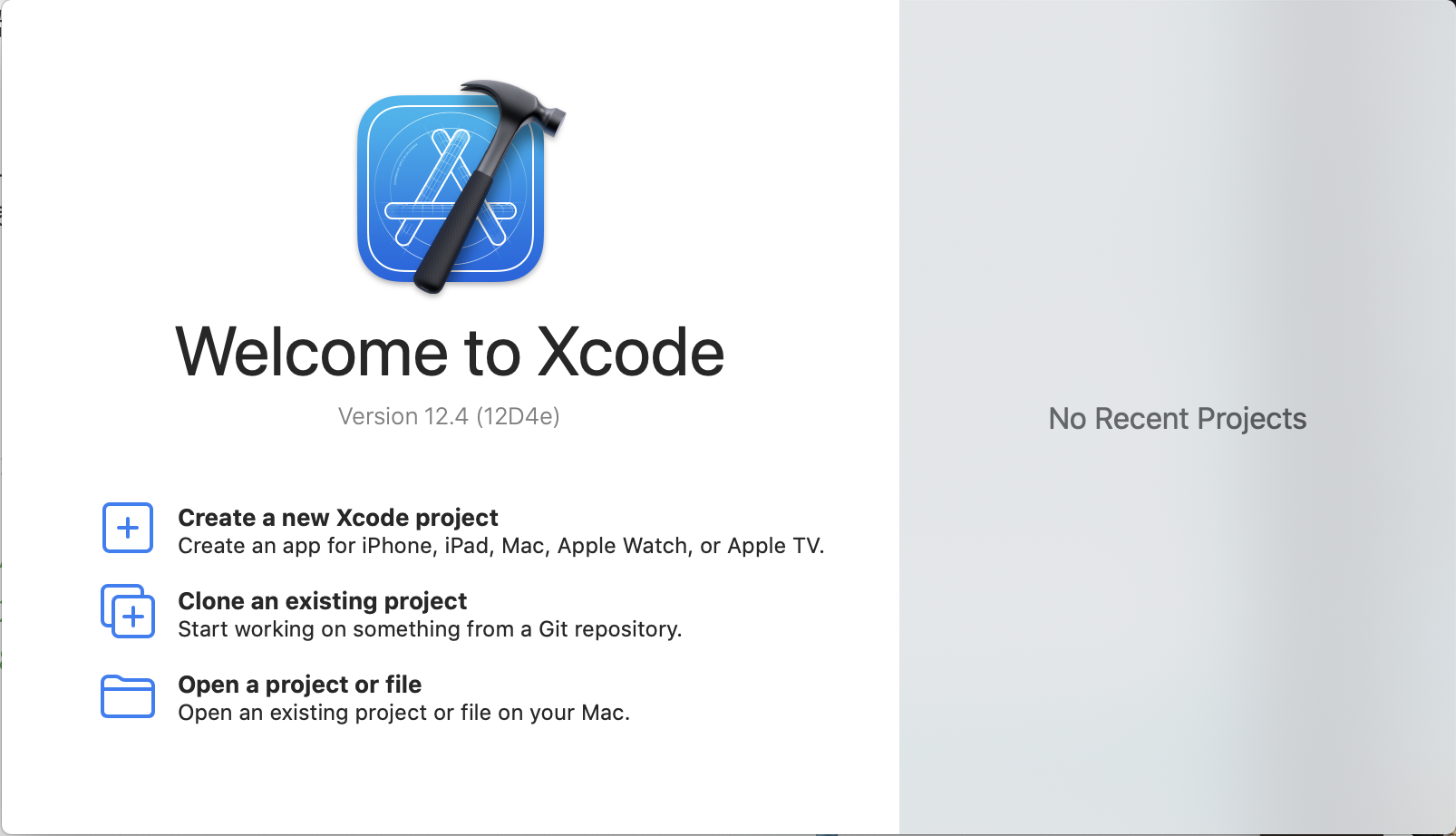 첫 실행 화면입니다. 오른쪽에 최근 프로젝트는 당연히 없다고 뜨고, 새 프로젝트를 만들어볼게요!