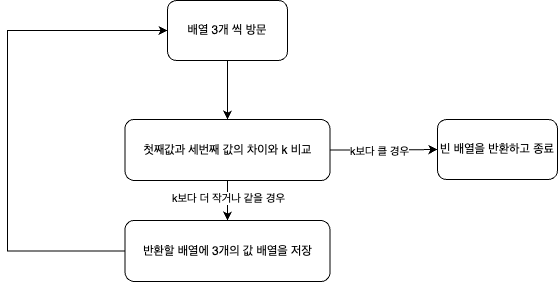 배열을 정렬하고 3개씩 방문하며 3개에서 첫째 값과 셋째 값의 차이가 k 이하이면 3개의 배열을 저장하고 아니면 함수를 종료하고 빈찬합을 준다