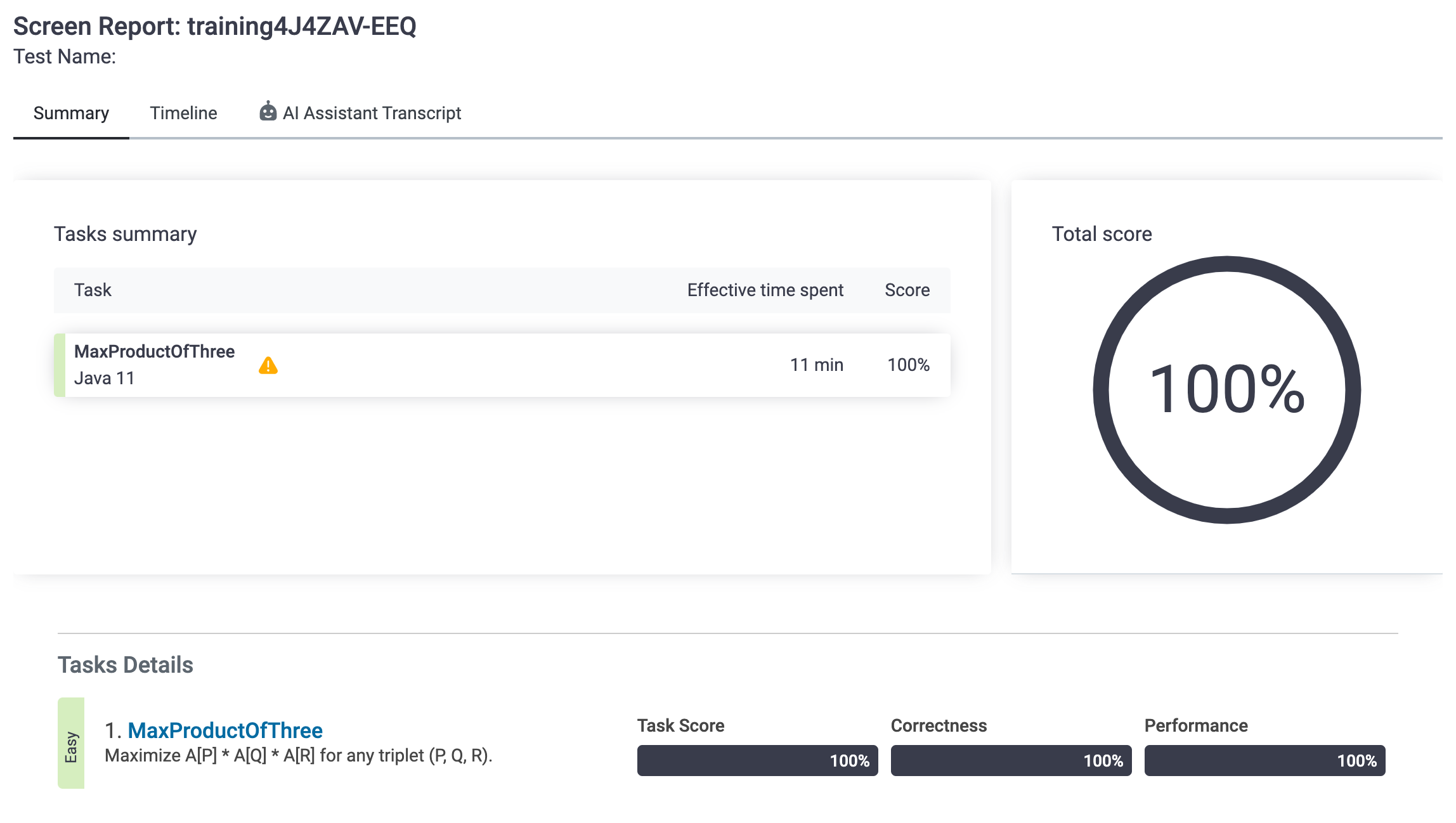A[0] = -3 A[1] = 1 A[2] = 2 A[3] = -2 A[4] = 5 A[5] = 6 함수는 삼중항 (2, 4, 5)의 곱이 최대이므로 60을 반환해야 합니다.