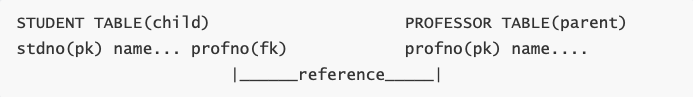 - 위 테이블에서, child 인 student 테이블에 데이터가 입력될때, 오른쪽 professor테이블 의 profno값을 먼저 확인하게 된다. 확인결과 사용자가 입력한 student의 profno값이 professor의 profno 컬럼에 존재하는 값이면, student 테이블에 입력을 허용하고, 만약 존재하지 않을 경우 에러 발생시키고 입력을 거부함.