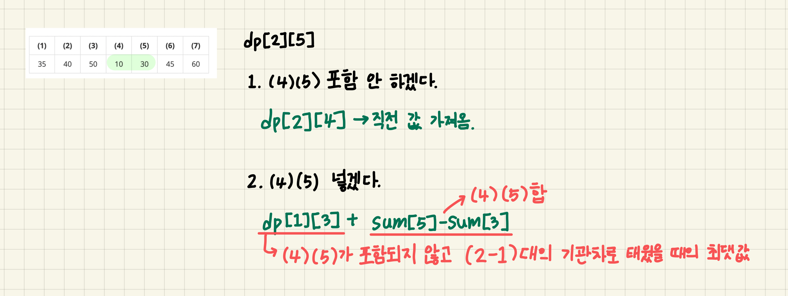 ex) dp[2][5] ⇒ 소형 기관차 2대가 있고, 객차는 1 ~ 5번만 존재하는 상황
