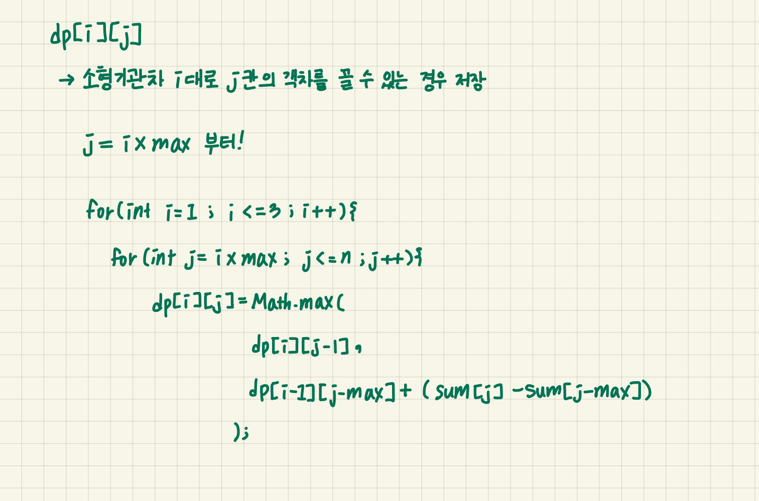 여기서 j = i * max 부터인 이유는 소형 기관차가 i대 있을 때, 최소 i * max 개의 객차는 끌기 때문!