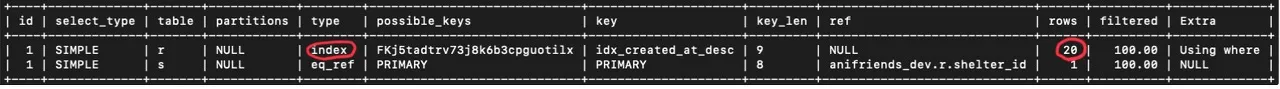 EXPLAIN 키워드만 붙이면 된다!EXPLAIN SELECT * FROM recruitment r JOIN shelter s ON r.shelter_id = s.shelter_id ORDER BY r.created_at desc limit 0, 20;