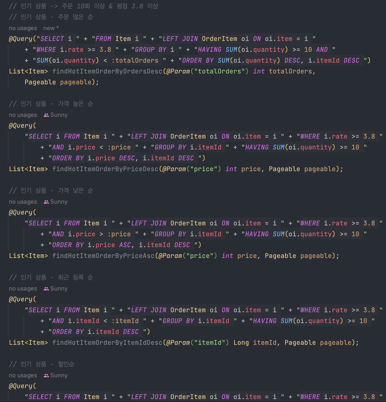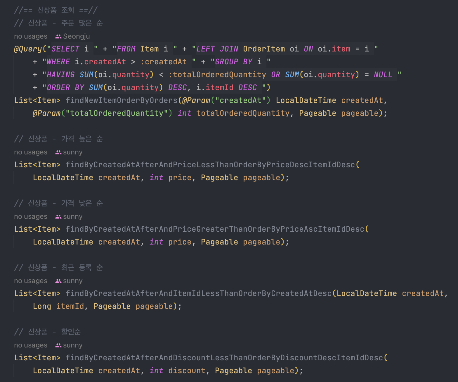 QueryDSL을 도입하기 전에는 5가지의 정렬과 신상품이라는 조건을 모두 만족시키기 위해서 5개의 JPA 메서드를 이용했다.