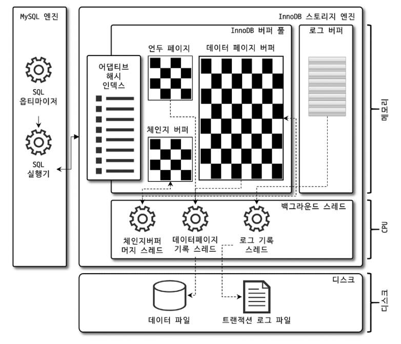 - InnoDB는 ACID(원자성, 일관성, 고립성, 지속성)를 지원하는 트랜잭션 안전(transaction-safe) 스토리지 엔진이다.
