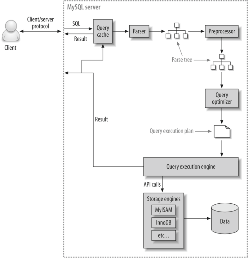 MySQL 엔진은 커넥션 핸들러, SQL 파서, 전처리기, 옵티마이저가 중심을 이룬다.